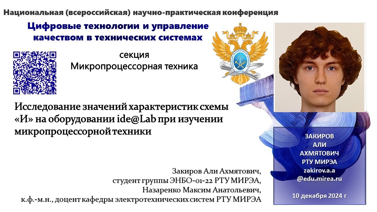 Закиров А.А., Назаренко М.А. Исследование значений характеристик схемы «И» на оборудовании ide@Lab при изучении микропроцессорной техники (объявление о выступлении 10 декабря 2024 года)