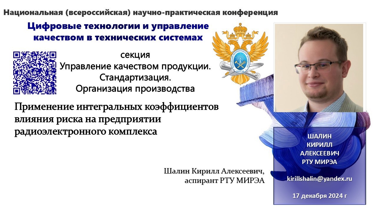 Шалин К.А. Применение интегральных коэффициентов влияния риска на предприятии радиоэлектронного комплекса (объявление о выступлении 17 декабря 2024 года)