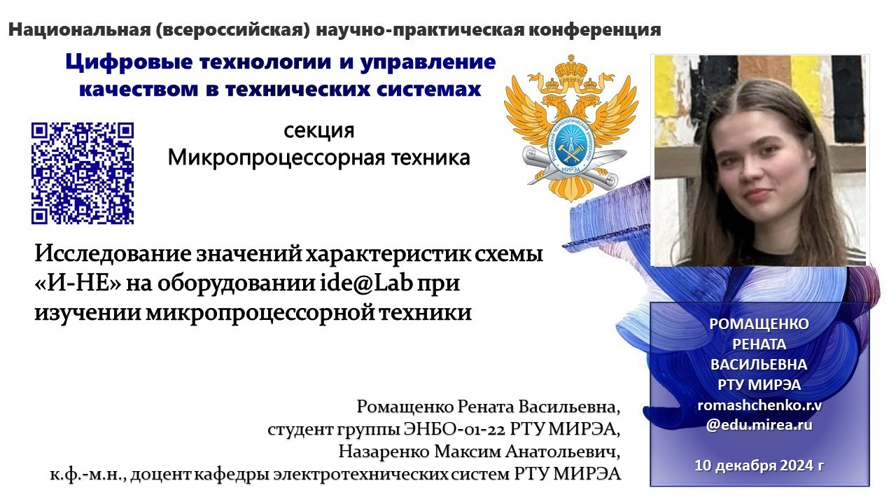 Ромащенко Р.В., Назаренко М.А. Исследование значений характеристик схемы «И-НЕ» на оборудовании ide@Lab при изучении микропроцессорной техники (объявление о выступлении 10 декабря 2024 года)