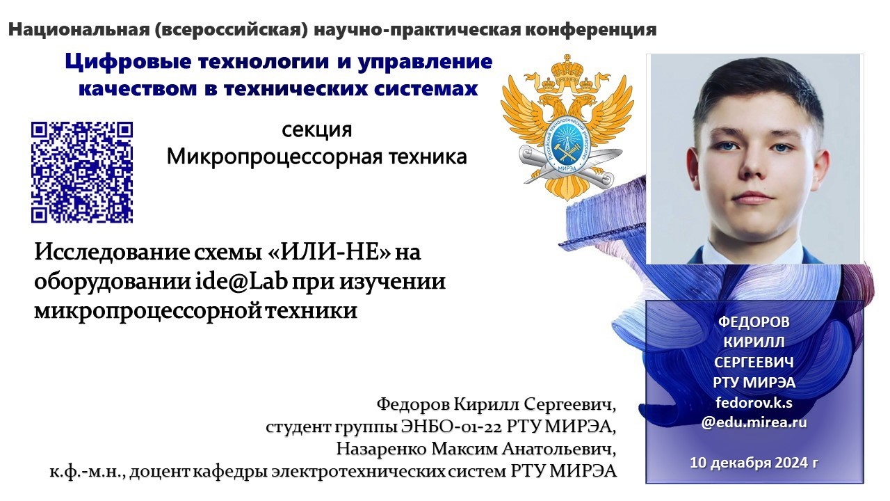 Федоров К.С., Назаренко М.А. Исследование схемы «ИЛИ-НЕ» на оборудовании ide@Lab при изучении микропроцессорной техники (объявление о выступлении 10 декабря 2024 года)