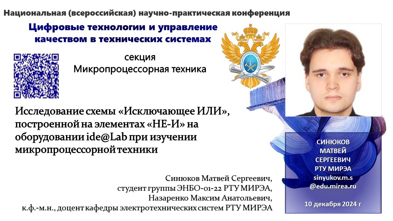 Синюков М.С., Назаренко М.А. Исследование схемы «Исключающее ИЛИ», построенной на элементах «НЕ-И» на оборудовании ide@Lab при изучении микропроцессорной техники (объявление о выступлении 10 декабря 2024 года)
