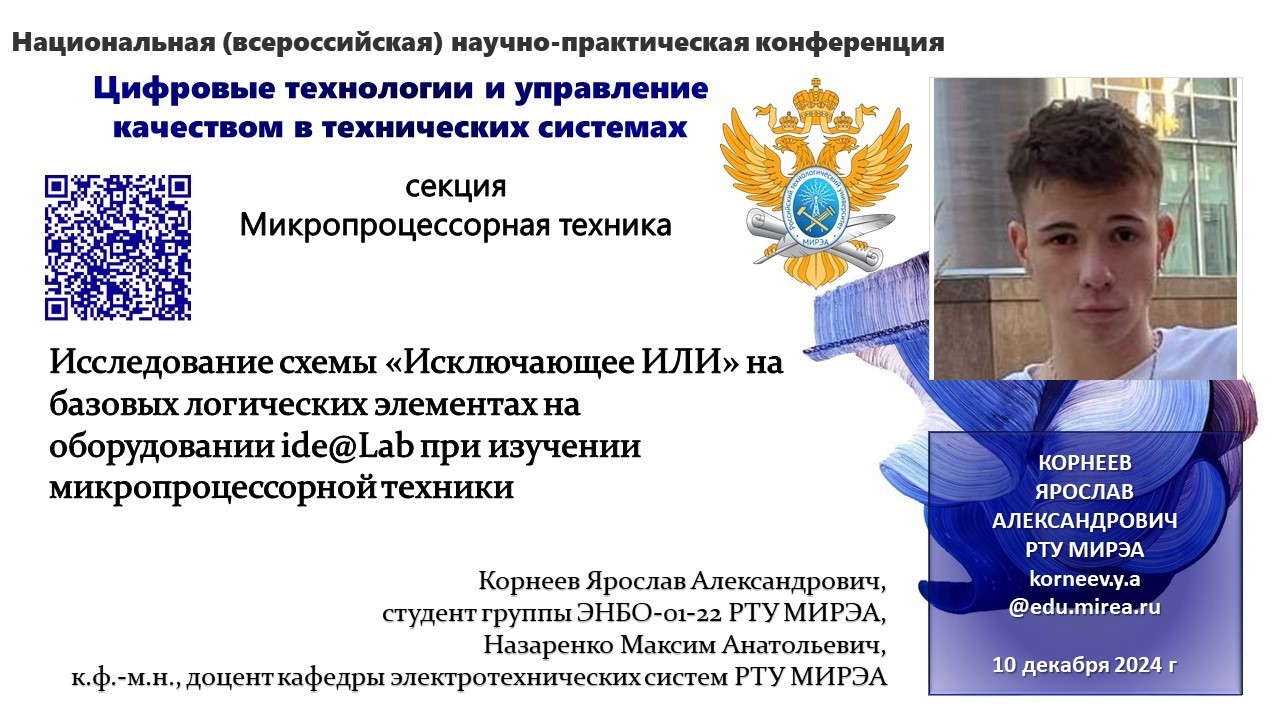 Корнеев Я.А., Назаренко М.А. Исследование схемы «Исключающее ИЛИ» на базовых логических элементах на оборудовании ide@Lab при изучении микропроцессорной техники (объявление о выступлении 10 декабря 2024 года)