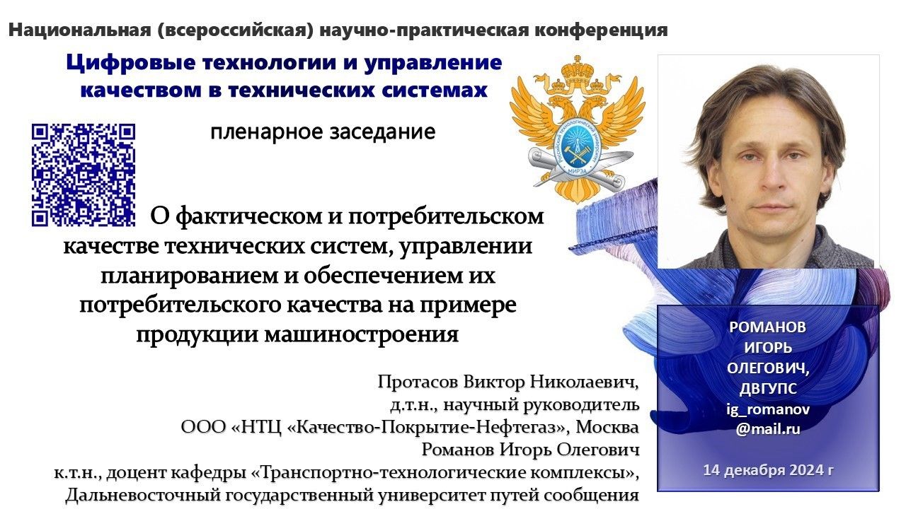 Протасов В.Н. Романов И.О. О фактическом и потребительском качестве технических систем, управлении планированием и обеспечением их потребительского качества на примере продукции машиностроения (объявление о выступлении 14 декабря 2024 года)