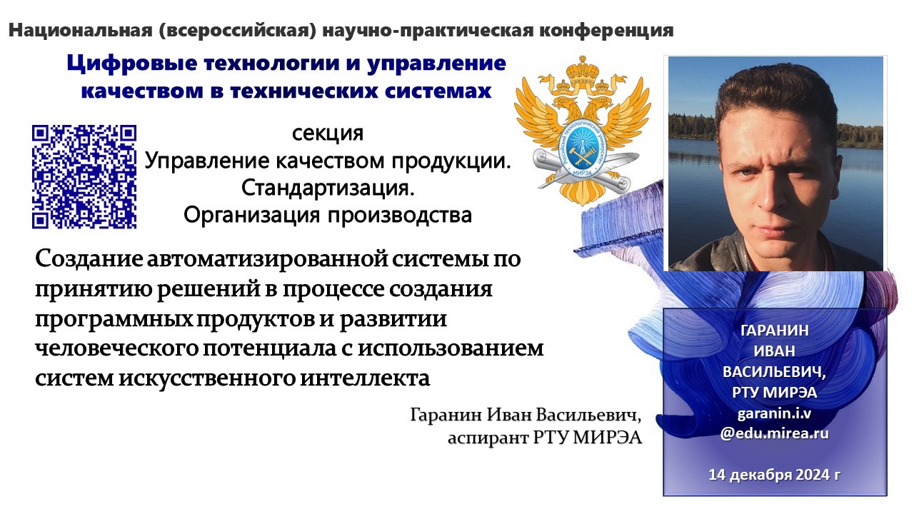 Гаранин И.В. Создание автоматизированной системы по принятию решений в процессе создания программных продуктов и развитии человеческого потенциала с использованием систем искусственного интеллекта (объявление о выступлении 14 декабря 2024 года)