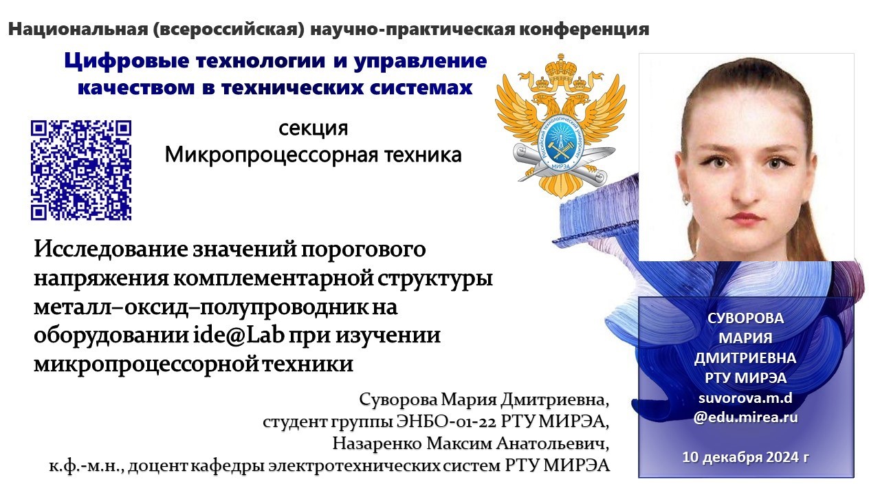 Суворова М.Д., Назаренко М.А. Исследование значений порогового напряжения комплементарной структуры металл–оксид–полупроводник на оборудовании ide@Lab при изучении микропроцессорной техники (объявление о выступлении 10 декабря 2024 года)