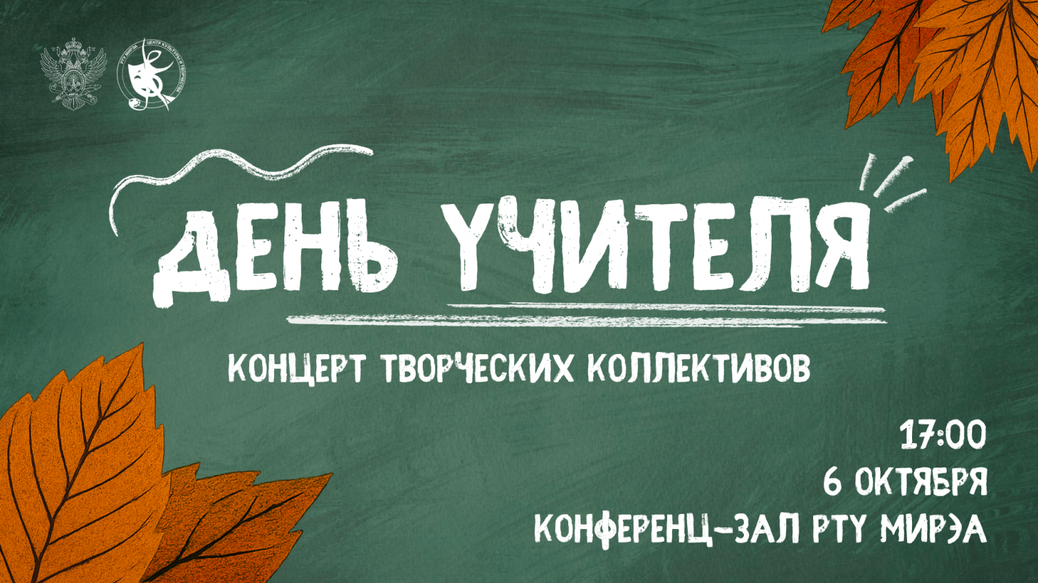 6 октября в 17:00 в Конференц-зале РТУ МИРЭА по адресу проспект Вернадского, 78, строение 14 состоится торжественный концерт, посвящённый Дню учителя! К участию приглашаются студенты и сотрудники РТУ МИРЭА.