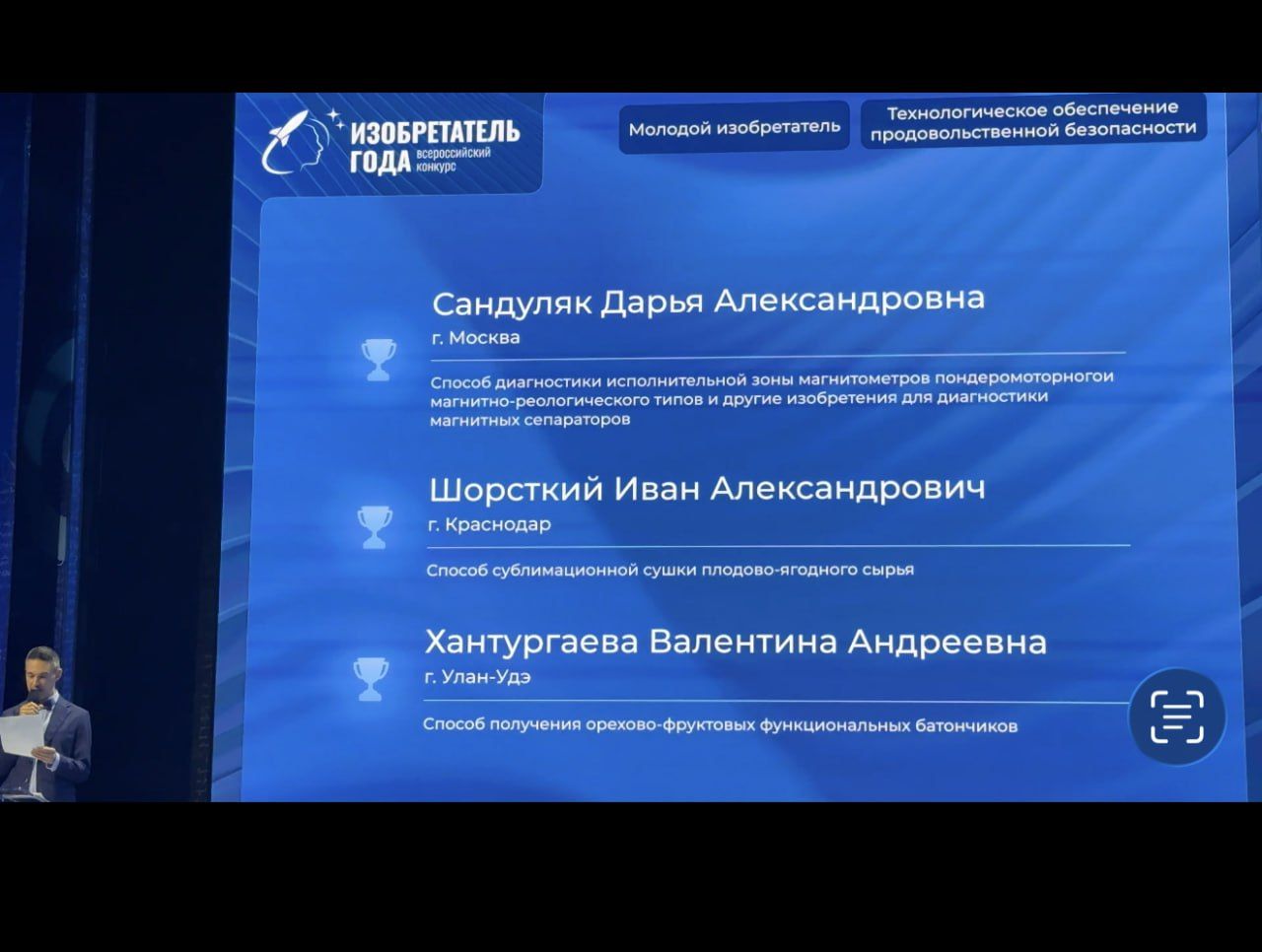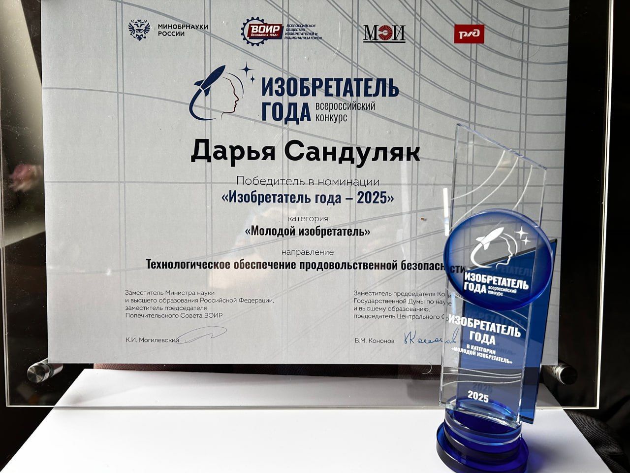 В номинации «Молодой изобретатель» по направлению «Технологическое обеспечение продовольственной безопасности» победу одержала молодой учёный, доцент кафедры «Приборы и информационно-измерительные системы» Института кибербезопаности и цифровых технологий РТУ МИРЭА Дарья Александровна Сандуляк.