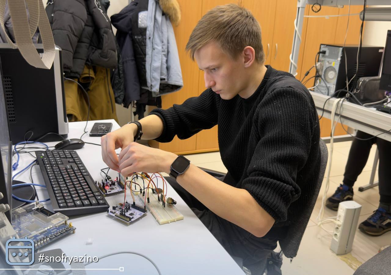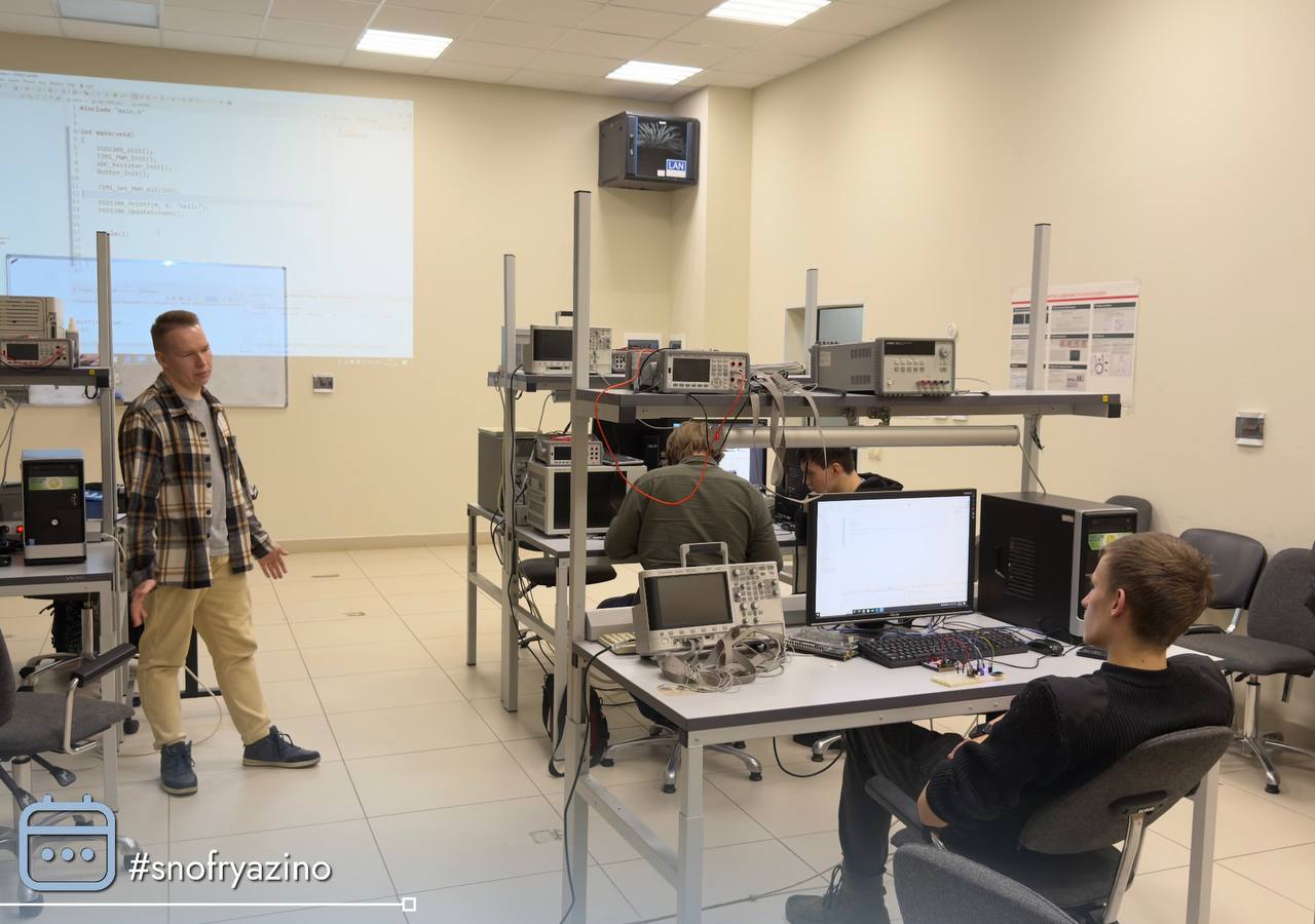 А в филиале РТУ МИРЭА в г. Фрязино студенты приняли участие в тематическом научном квизе, где проверили знания в сфере электроники, конструирования и IT. После квиза состоялся мастер-класс по микроконтроллерам. Участники познакомились с микроконтроллером STM32: изучили теорию и собрали на макетной плате схему с RGB-светодиодом, потенциометром и OLED-дисплеем. На языке Си они написали программу, которая управляет светодиодом — включает, регулирует яркость при помощи потенциометра и выводит сообщение на дисплей.