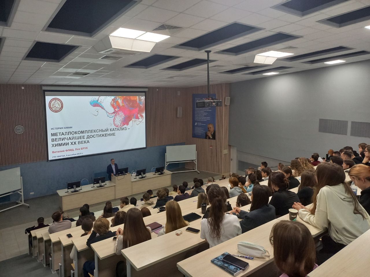 9 декабря в рамках празднования 125-летия ИТХТ имени М.В. Ломоносова состоялись Юбилейные XV Ломоносовские чтения, на которых с докладами выступили ведущие учёные в области каталитической химии. Активисты СНО ИТХТ имени М.В. Ломоносова 9 декабря посетили научный семинар «Цифровое будущее фармацевтики», который был организован и проходил в посольстве Швейцарии. На семинаре выступали представители фармацевтических компаний Ferring Production Russia, Roche и Novartis и рассказали о своих продуктах и идеях внедрения технологий искусственного интеллекта в фармацевтическую отрасль. 10 декабря Ирина Юрина и Артемий Пайбердин, активисты СНО ИТХТ имени М.В. Ломоносова, приняли участие в церемонии награждения победителей конкурса «УМНИК», которая проходила в Правительстве Липецкой области в рамках конференции «Регион возможностей: от оптимизации процессов к стратегии эффективности». А представители СНО ИТХТ имени М.В. Ломоносова в составе делегации РТУ МИРЭА представили СНО университета на региональном конкурсе города Москвы и Московской области. 11 декабря в ИТХТ имени М.В. Ломоносова РТУ МИРЭА при поддержке студенческого научного общества РТУ МИРЭА в рамках фестиваля «АтомФест» состоялся кинопоказ «КиноПрофи» от Госкорпорации «Росатом». Программа включала не только знакомство с предприятиями Госкорпорации «Росатом» посредством киноматериалов, но и встречу со специалистами данных предприятий. Гости поделились личным опытом построения карьеры и рассказали о современных вызовах отрасли. Активисты НУГ «Функциональные наноматериалы» 12–13 декабря приняли участие в работе Российского форума технологического предпринимательства, на котором представили свою разработку электролитно-плазменной системы очистки воды от органических поллютантов.