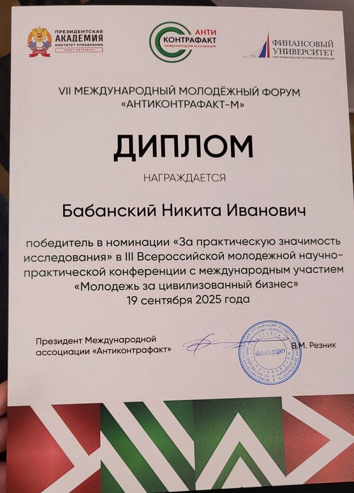 Научно-исследовательская работа студента Института кибербезопасности и цифровых технологий РТУ МИРЭА, активного участника научно-учебной группы «Цифровая аналитика» СНО ИКБ МИРЭА Никиты Бабанского победила в номинации «За практическую значимость исследования». Никита награждён дипломом победителя VII Международного молодёжного форума «Антиконтрафакт-М».