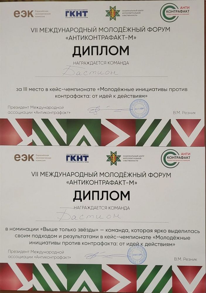 На полях форума состоялся кейс-чемпионат «Молодёжные инициативы против контрафакта: от идей к действиям». Яркой особенностью мероприятия стала дружеская конкуренция смешанных команд из разных стран. В составе команды «Бастион» Мария Утенкова и Никита Бабанский заняли третье место.