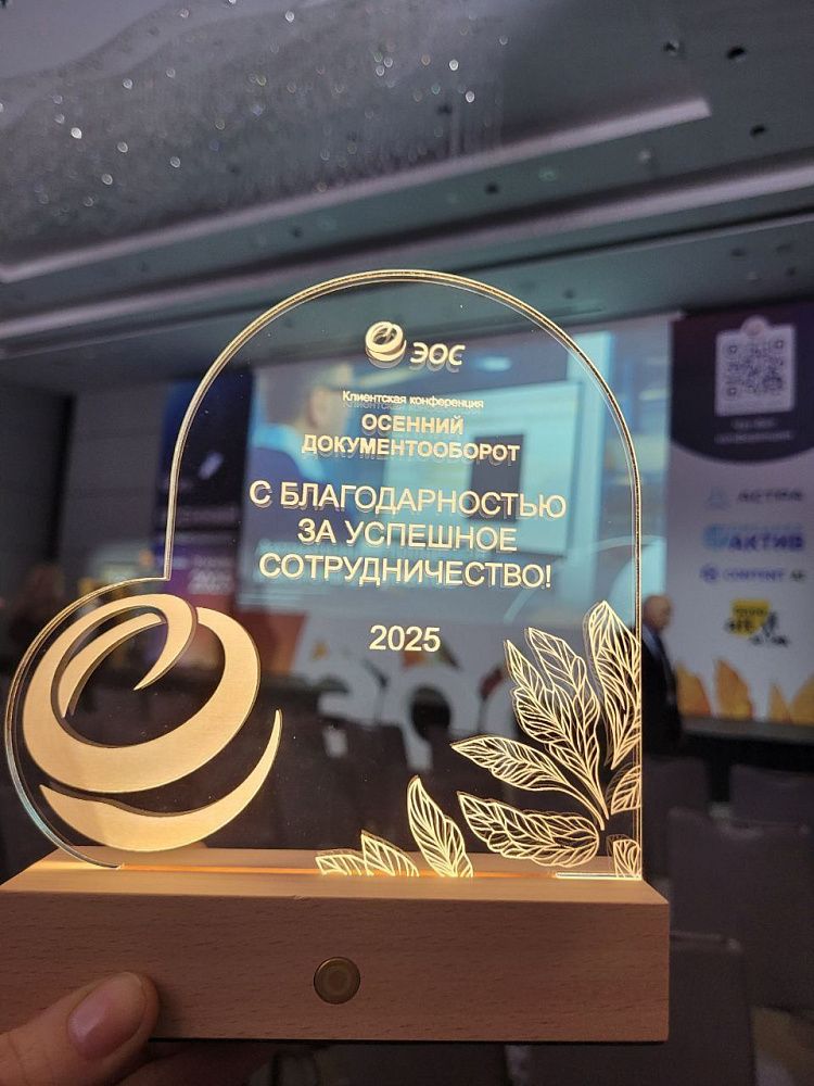 Традиционно на конференции компания «ЭОС» отмечает своих клиентов, добившихся наиболее значимых успехов в реализации проектов по цифровизации. В этом году РТУ МИРЭА был удостоен почётного знака «За успешное сотрудничество». Эта награда является признанием вклада университета в подготовку кадров для отрасли в области электронного документооборота. Награду заведующему кафедрой истории и документоведения Ольге Геннадьевне Савка вручил председатель совета директоров ГК «ЭОС», к.т.н. Владимир Баласанян.
