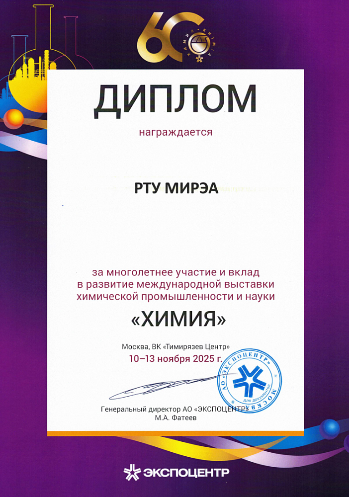 РТУ МИРЭА, являясь постоянным участником выставки «Химия», и в этом году принял активное участие в событиях выставочной и деловой программы мероприятия, проходившего в ВК «Тимирязев Центр» с 10 по 13 ноября.