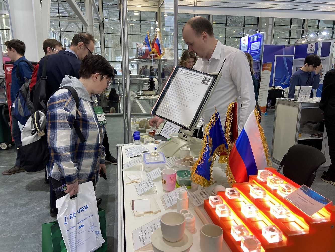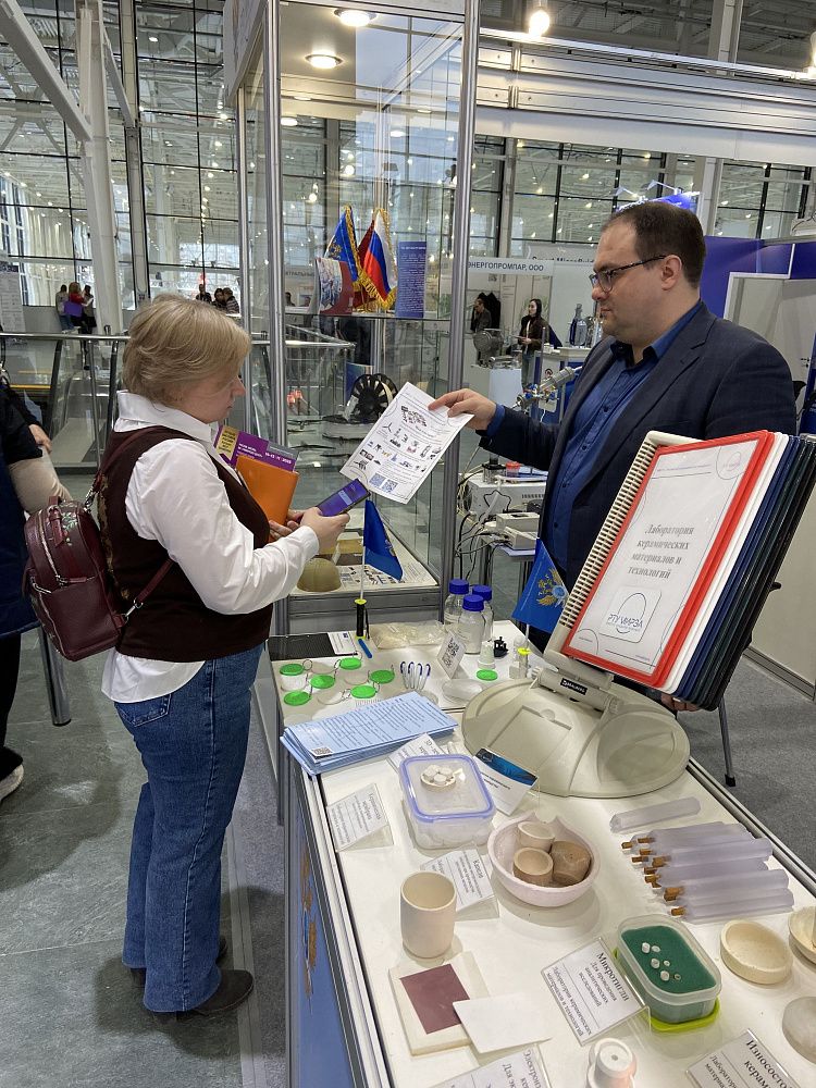 В выставочной части университет расположился на просторном стенде, где представил результаты научно-исследовательских работ по различным направлениям, таким как технологии переработки эластомеров, переработки пластмасс и полимерных композитов, технологии в области высокомолекулярных соединений и технологии инженерии материалов, разработки керамических материалов.