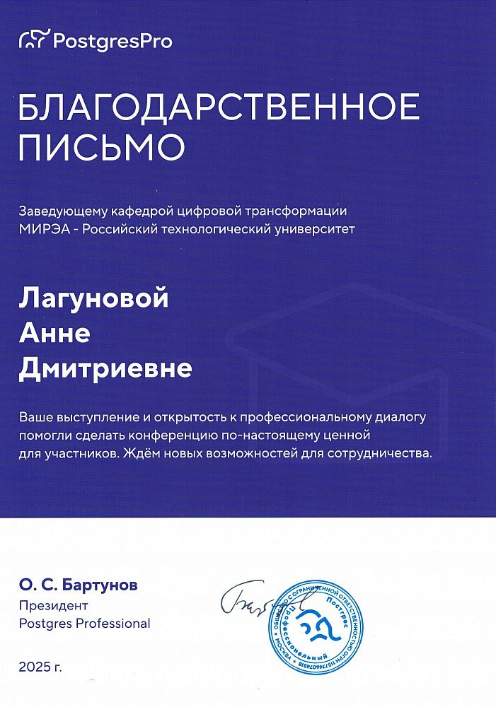 6 октября в Москве прошла вторая ежегодная конференция PGConf.Academy 2025, организованная компанией Postgres Professional. Мероприятие собрало более 440 преподавателей и представителей вузов и колледжей, готовящих специалистов в сфере информационных технологий. РТУ МИРЭА представили сотрудники кафедры цифровой трансформации Института информационных технологий: заведующая кафедрой А.Д. Лагунова, профессор Н.А. Семыкина, доценты А.Э. Дзгоев и М.В. Исаева, ассистенты Н.Л. Ужахов и Г.Д. Шерри.