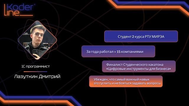 Спикером выступил Дмитрий Лазуткин, студент 2-го курса РТУ МИРЭА и разработчик «1С» в компании ООО «Кодерлайн», являющейся официальным партнёром университета. В своём выступлении Дмитрий поделился личным опытом профессионального роста, которого ему удалось достичь всего за год обучения.