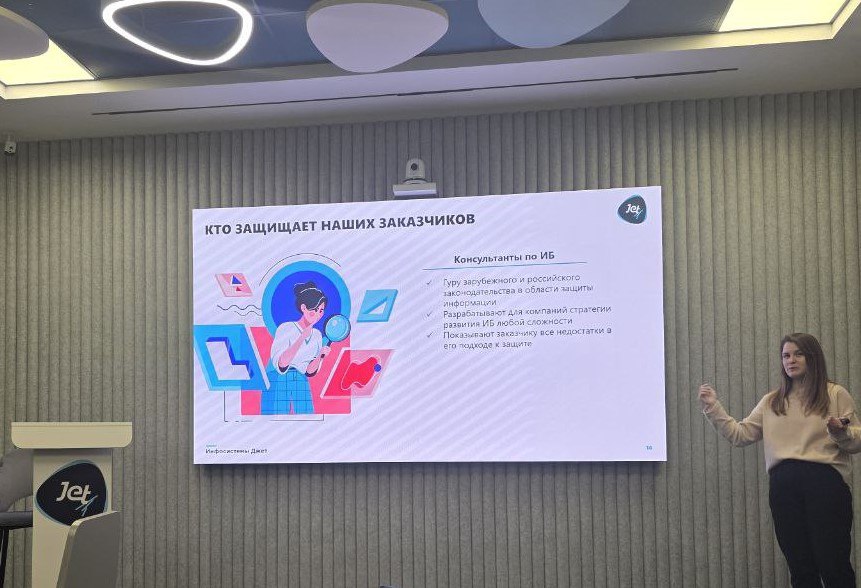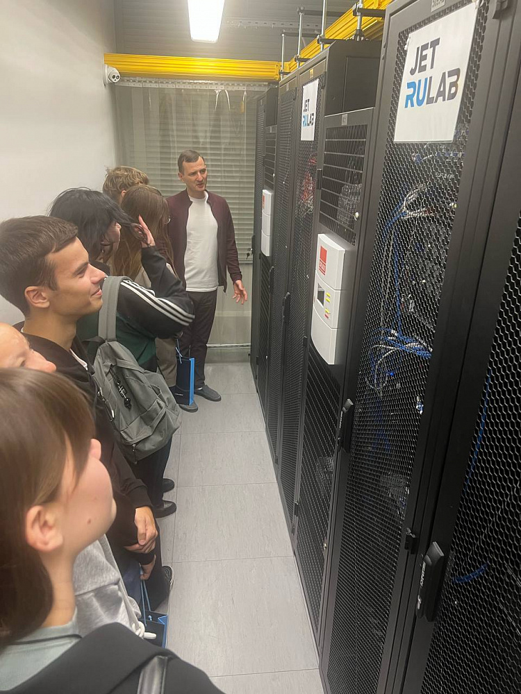 Особый интерес вызвали технические зоны: студенты посетили демонстрационную комнату видеоконференцсвязи, ознакомились с работой лаборатории JET RULAB — центра тестирования и апробации ИТ-решений, а также получили представление о деятельности центра кибербезопасности JetCSIRT, занимающегося оперативным реагированием на инциденты информационной безопасности.