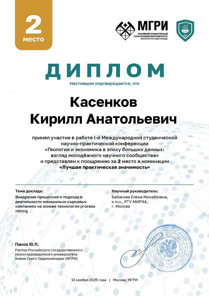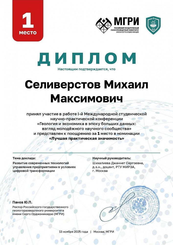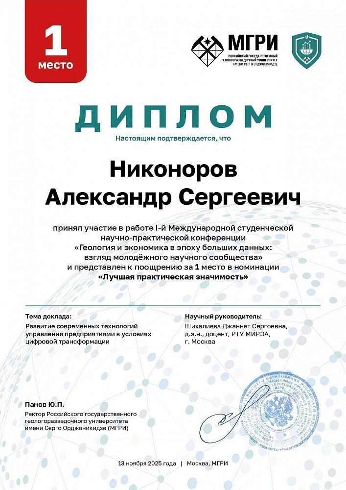 13 ноября студенты 1-го и 3-го курсов направления 38.03.02 «Менеджмент» (профиль Управление бизнес-процессами) кафедры современных технологий управления Института технологий управления приняли участие в I Международной студенческой научно-практической конференции «Геология и экономика в эпоху больших данных: взгляд молодёжного научного сообщества», прошедшей на базе Российского государственного геологоразведочного университета имени Серго Орджоникидзе (МГРИ).