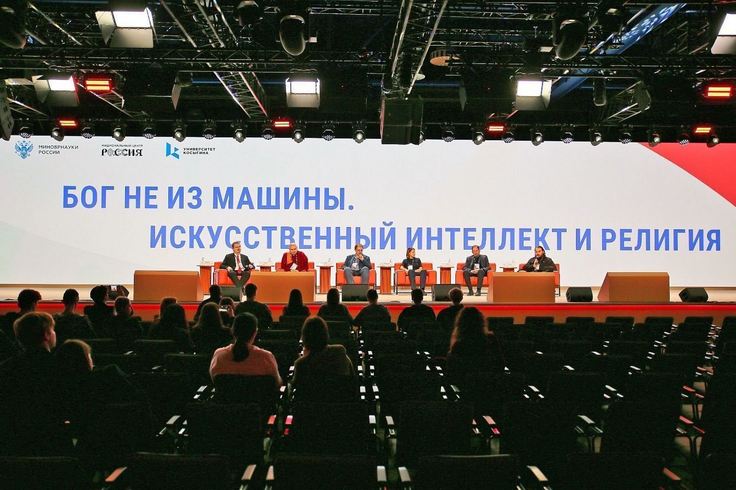 После официальной части, которая также включала концертные номера, студенты РТУ МИРЭА приняли участие в работе тематических секций. Наибольший интерес вызвала секция «Бог не из машины. Искусственный интеллект и религия», где студент С. Броимшоев (группа УЭБО-07-25) активно задавал спикерам вопросы.