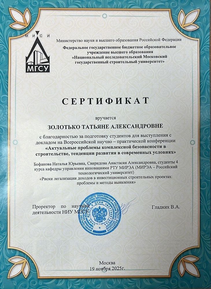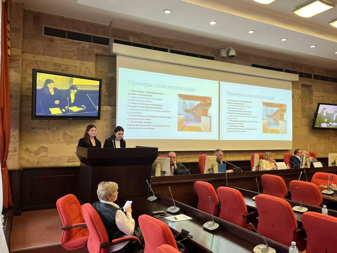 Наталья Юрьевна Бофанова и Анастасия Александровна Свиридова под научным руководством к.э.н., доцента кафедры управления инновациями Татьяны Александровны Золотько выступили с докладом на тему «Риски легализации доходов в инвестиционных строительных проектах: проблемы и методы выявления».