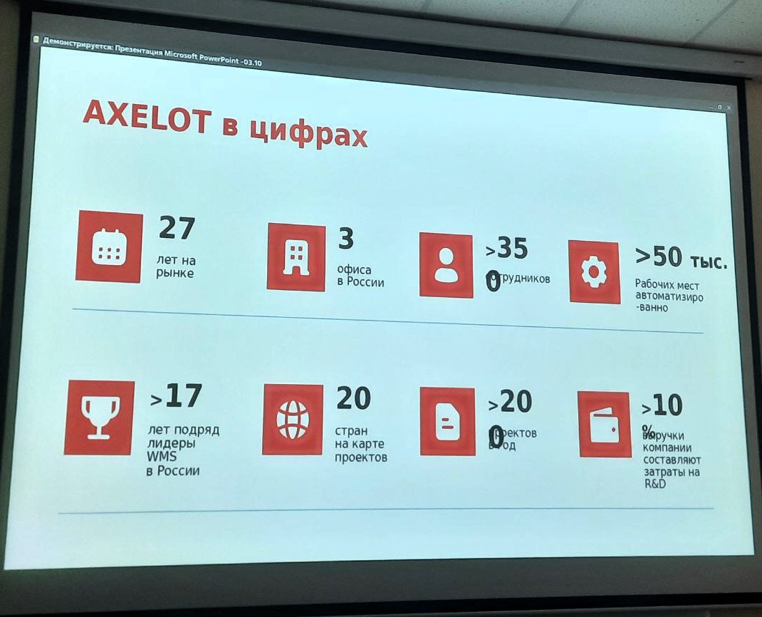 В ходе встречи студенты узнали о ключевых функциональных возможностях программных продуктов «AXELOT», таких как управление складскими операциями, парком транспортных средств и процессами организации грузоперевозок. Также представитель компании поделилась кейсами успешного применения этих решений в компаниях-лидерах рынка.