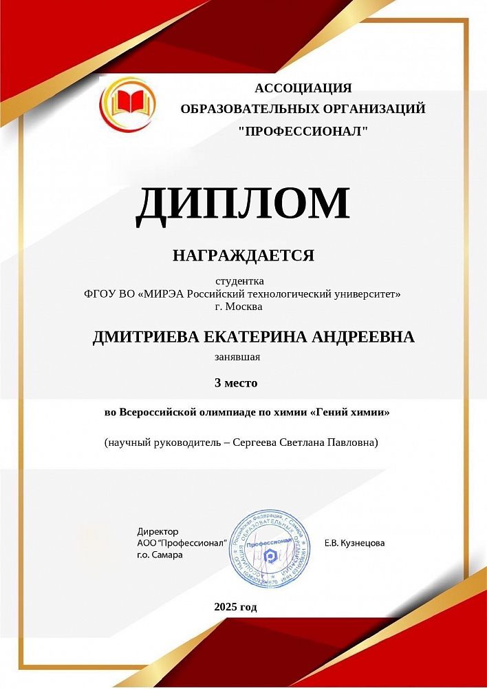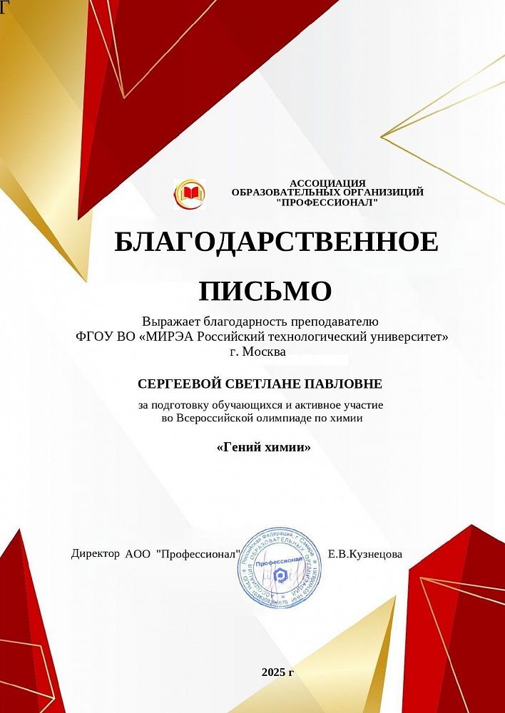 В результате участия студенты награждены соответствующими дипломами, а преподаватель химии Светлана Павловна Сергеева получила благодарственное письмо за подготовку обучающихся к олимпиаде.