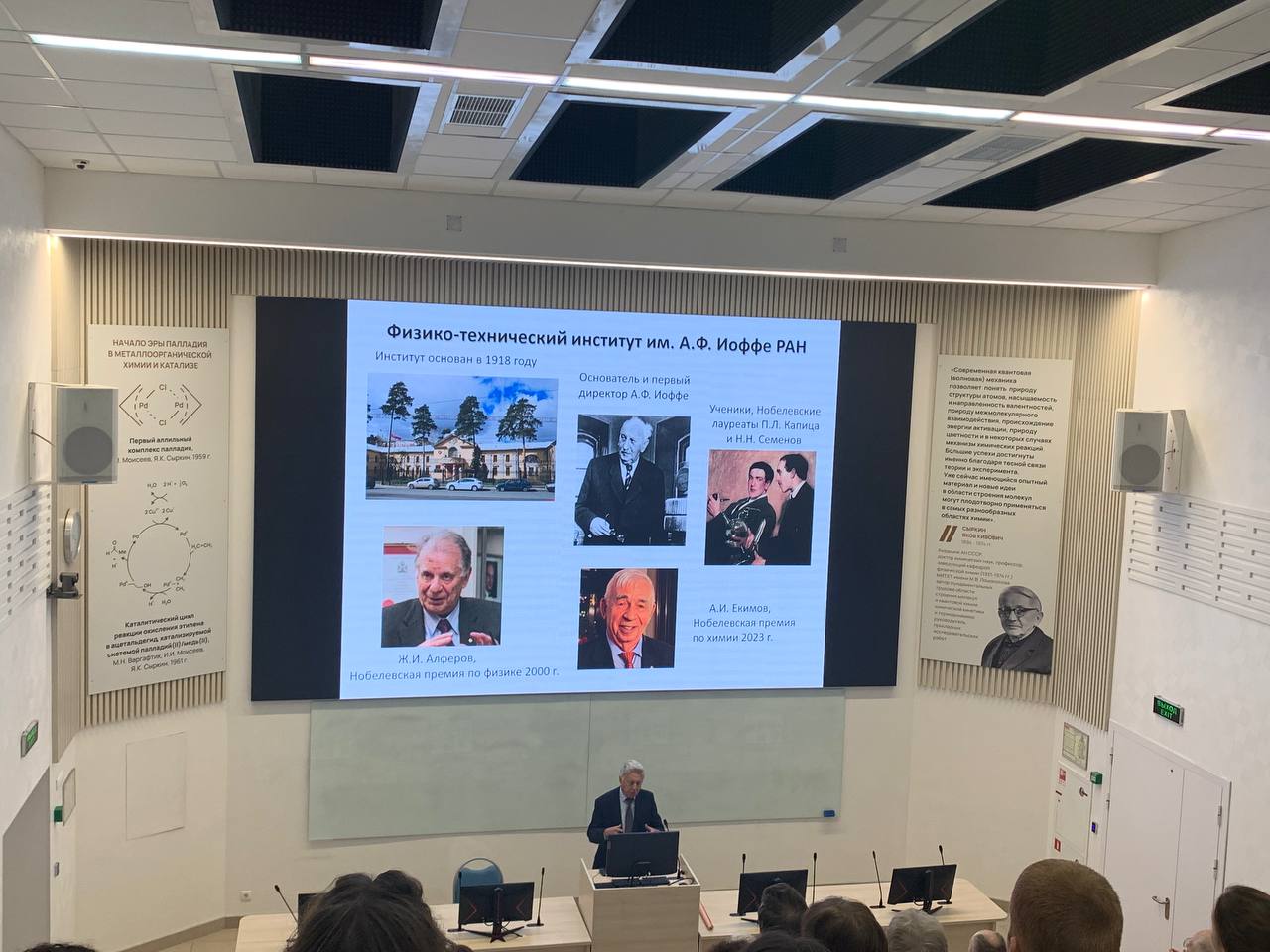 В начале доклада Сергей Александрович кратко рассказал об истории физико-технического института имени А.Ф. Иоффе РАН, основанного в 1918 году. Институт — альма-матер для многих известных учёных — нобелевских лауреатов, которые внесли неоценимый вклад в развитие химии и физики. Например, Н.Н. Семёнов стал лауреатом премии по химии в 1956 году за разработку теории цепных реакций. П.Л. Капица получил премию по физике в 1978 году за открытие сверхтекучести жидкого гелия. Ж.И. Алферов получил Нобелевскую премию по физике в 2000 году за разработку полупроводниковых гетероструктур и создание быстрых опто- и микроэлектронных компонентов. А.И. Екимов получил премию по химии за открытие и синтез квантовых точек.